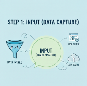 Input: A trigger (such as a form submission, message, API call, or system event) captures raw data and signals the automation to start.