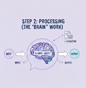 Processing: An AI and logic layer analyzes the input using rules and models to understand context, extract meaning, and determine the next best action.