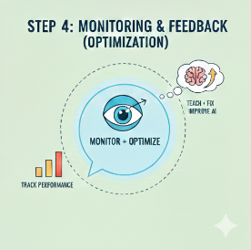 Monitoring: Logs, metrics, and user feedback are reviewed to detect errors, measure performance, and continuously optimize accuracy, cost, and reliability.